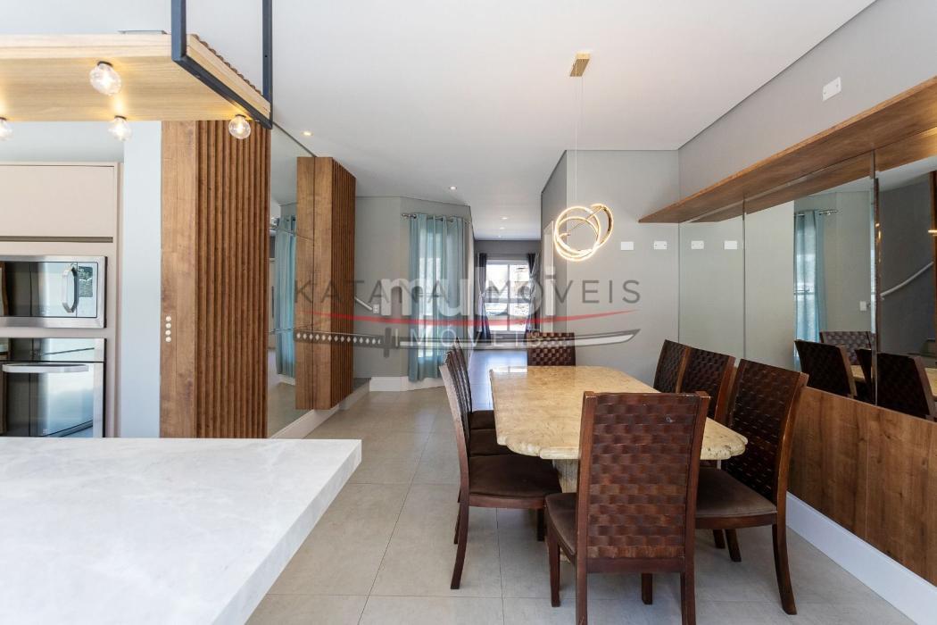 Sala de jantar integrada com a cozinha totalmente mobiliada. Cozinha e lavanderia com móveis planejados.
