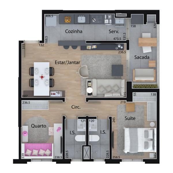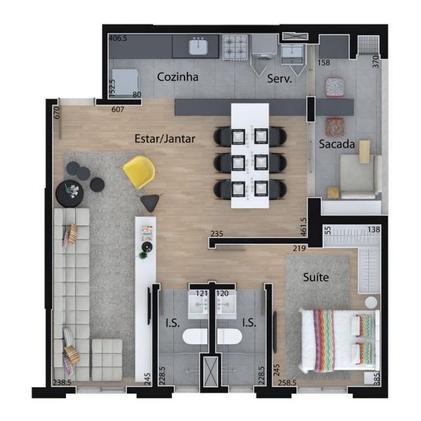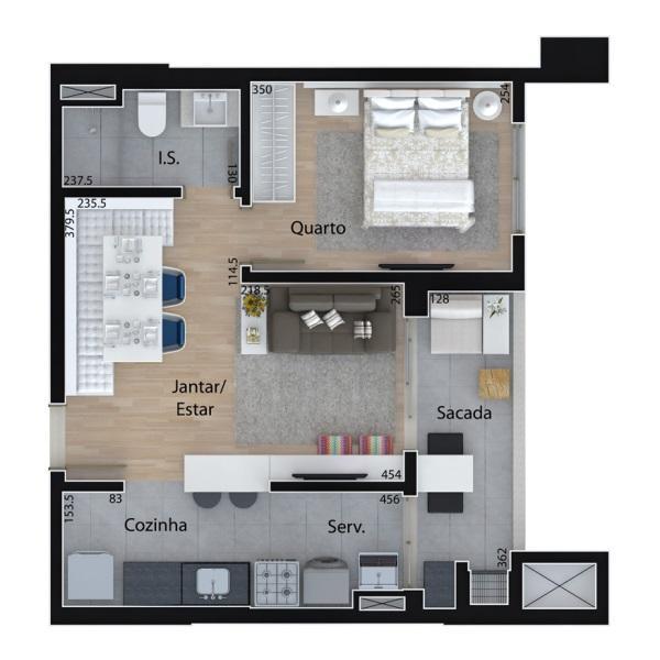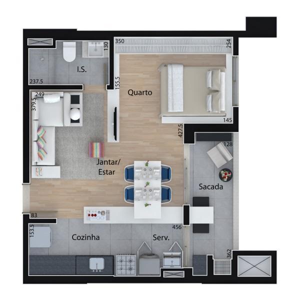 Perfeito para quem busca um lar moderno e aconchegante, com um dormitório, o espaço é otimizado para proporcionar conforto e funcionalidade. A sacada com churrasqueira é o local ideal para desfrutar de momentos de descontração, oferecendo uma vista livre que torna cada dia especial. O apartamento está situado em um andar alto, permitindo uma excelente ventilação e iluminação natural.