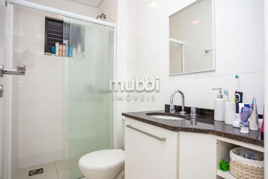 Banheiro com blindex e armário sob medida.