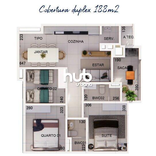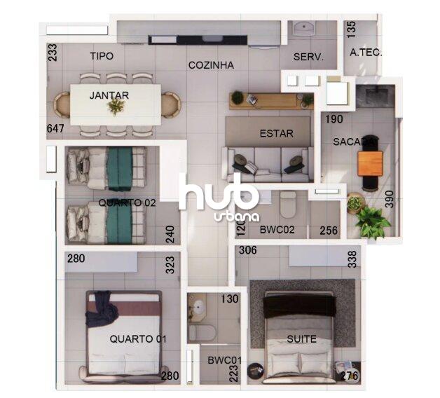 Planta Tipo 01 – 95,00 m², com três quartos (sendo uma suíte), sala integrada com cozinha e jantar, sacada gourmet com churrasqueira e uma vaga de garagem.