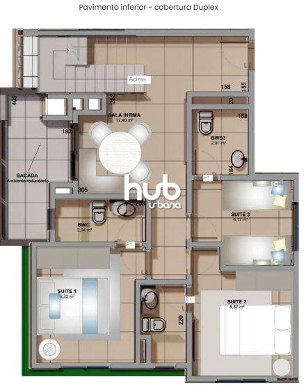 Planta Tipo 03 – 98,00 m², com living estendido, churrasqueira a carvão e ampla sacada.