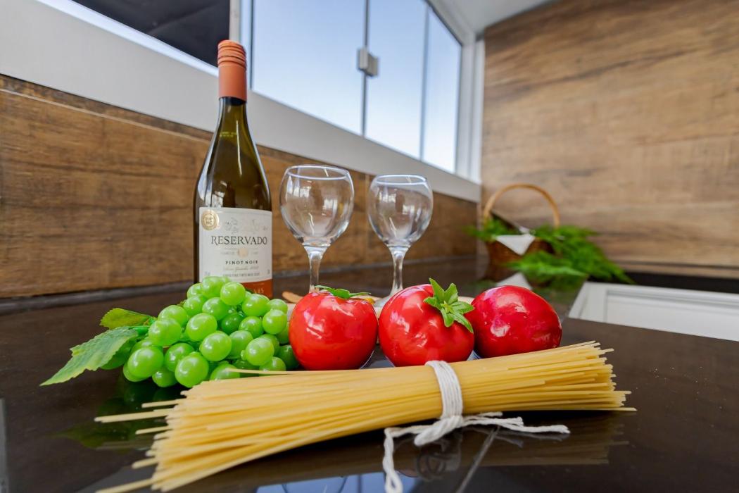 Pavimento térreo possui sala com sacada, 2 quartos, banheiro social com pia em granito e box em vidro temperado, cozinha toda com armários com pia e tampo em granito.