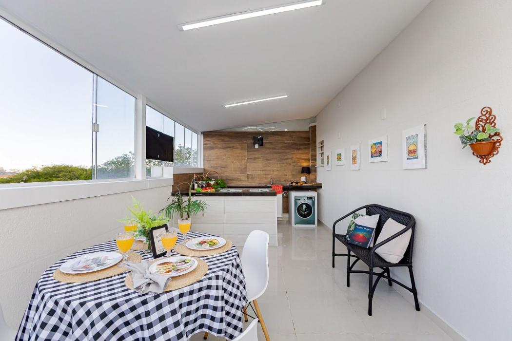 Pavimento superior possui sala com lavabo, espaço gourmet com pia e tampo em granito com balcão, lavanderia externa coberta e fechada.