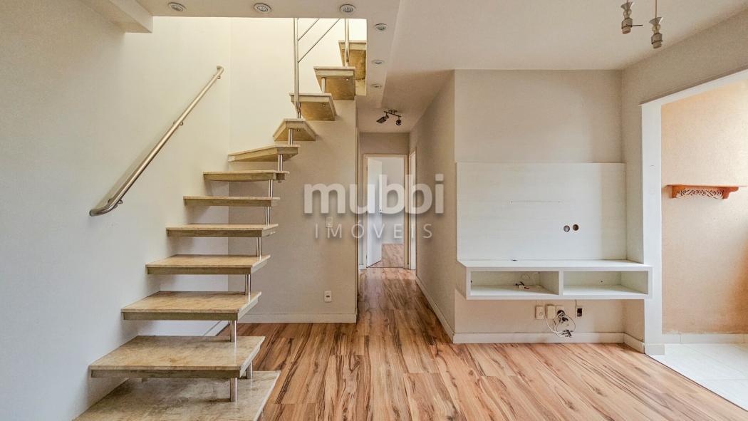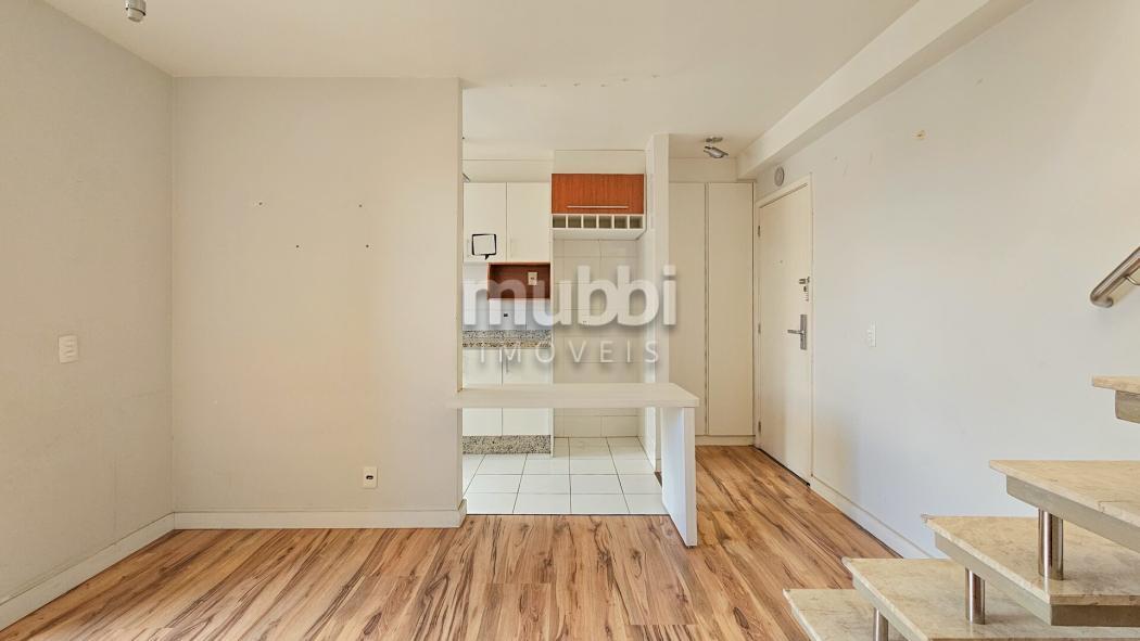 Apartamento com dois pavimentos, sendo o inferior apartamento tipo e o superior ático com terraço, lavabo e área de serviço coberta.