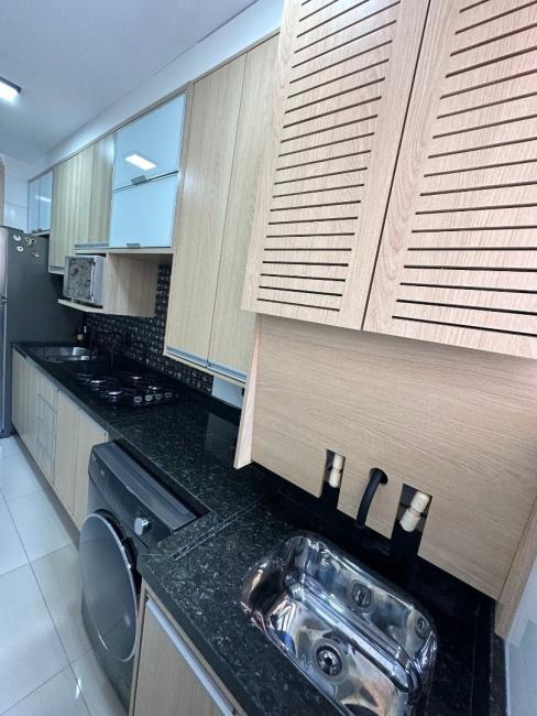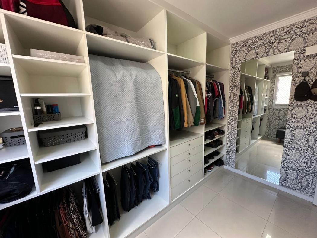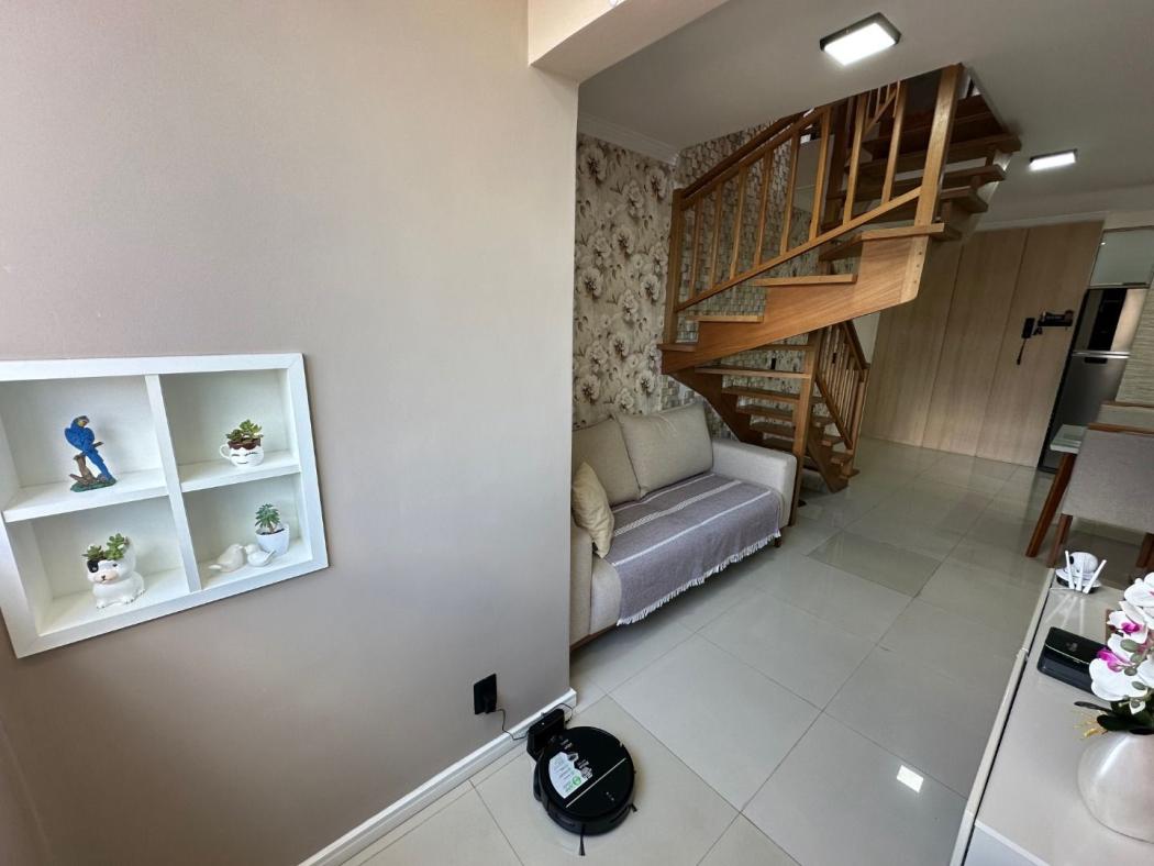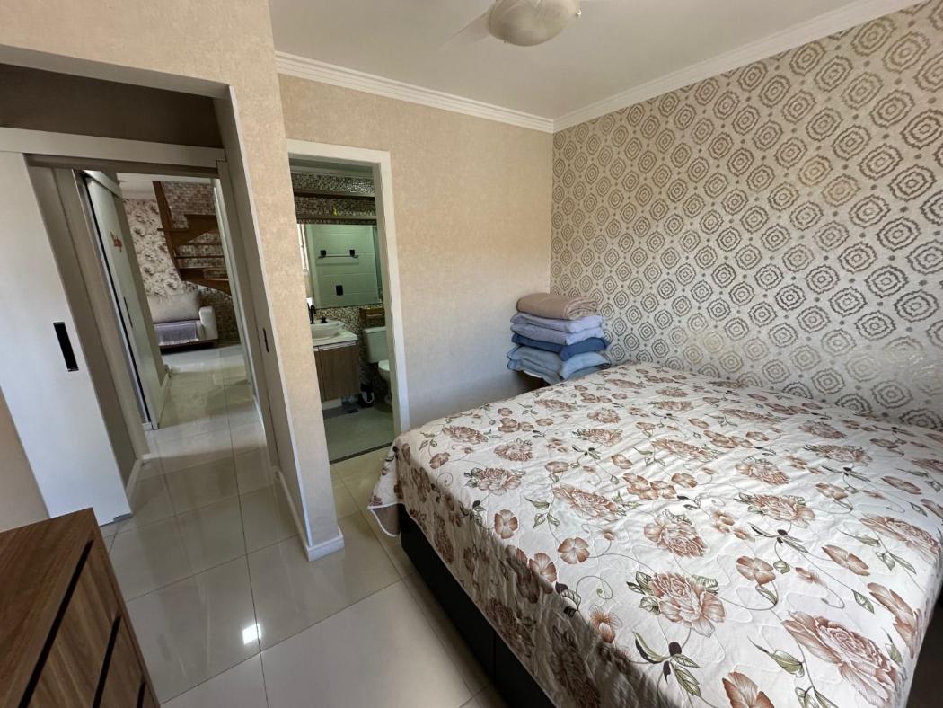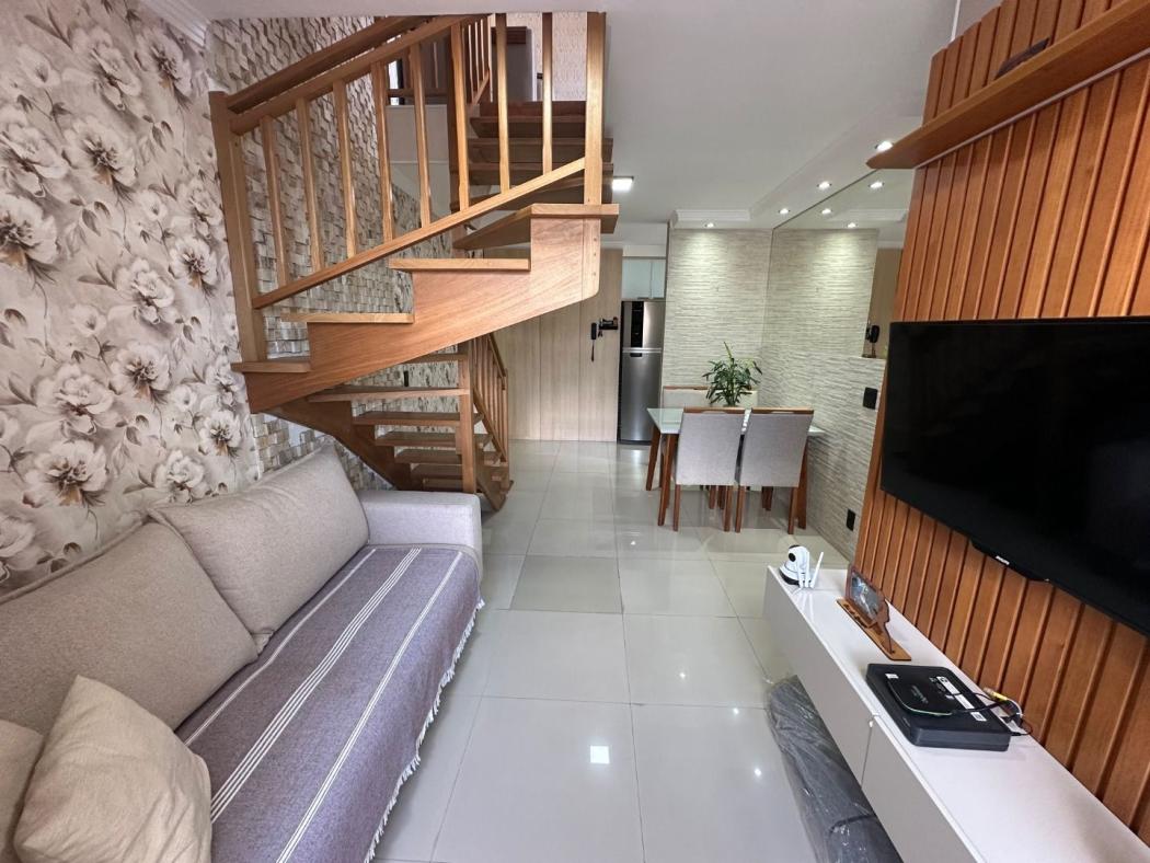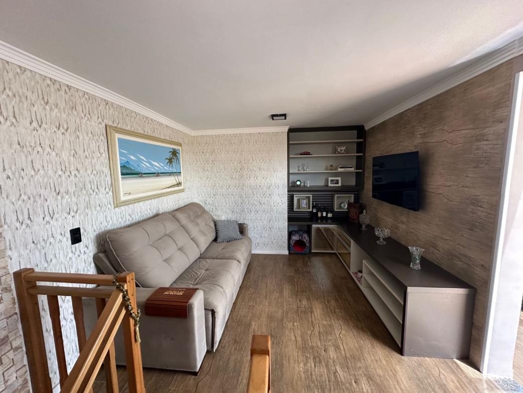 Pavimento inferior possui sala para 2 ambientes toda com sanca em gesso e espelho, painel de tv, sacada integrada a sala com churrasqueira, cozinha toda montada com armários embutidos com pia e tampo em granito com fogão cook top, corredor possui o banheiro social com box em vidro temperado com nicho, e ducha, 3 quartos sendo 1 suíte, o quartos de solteiro e 1 dos quartos com armários, a suíte possui painel de TV com gaveteiros, a janelas dos quartos todas com persianas embutidas, sala com cortina sob medida, a escada e toda em madeira maciça.