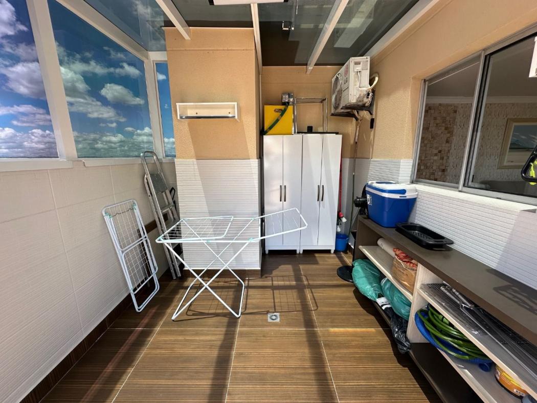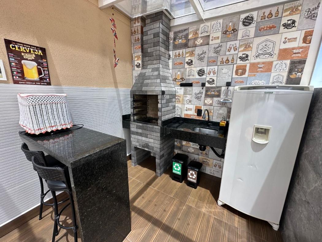 Pavimento superior possui sala intima com armários, ar condicionado, ampla área de lazer coberta e fechada em vidro com churrasqueira, pia e balcão em granito, depósito fechado em vidro e área aberta.