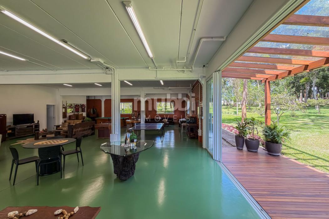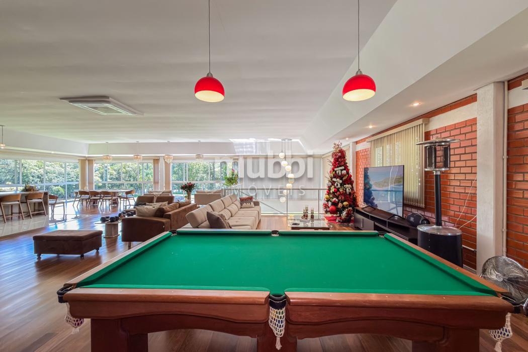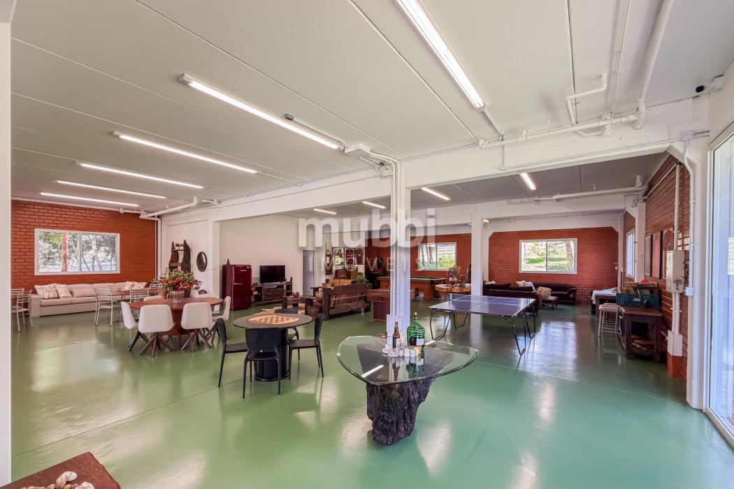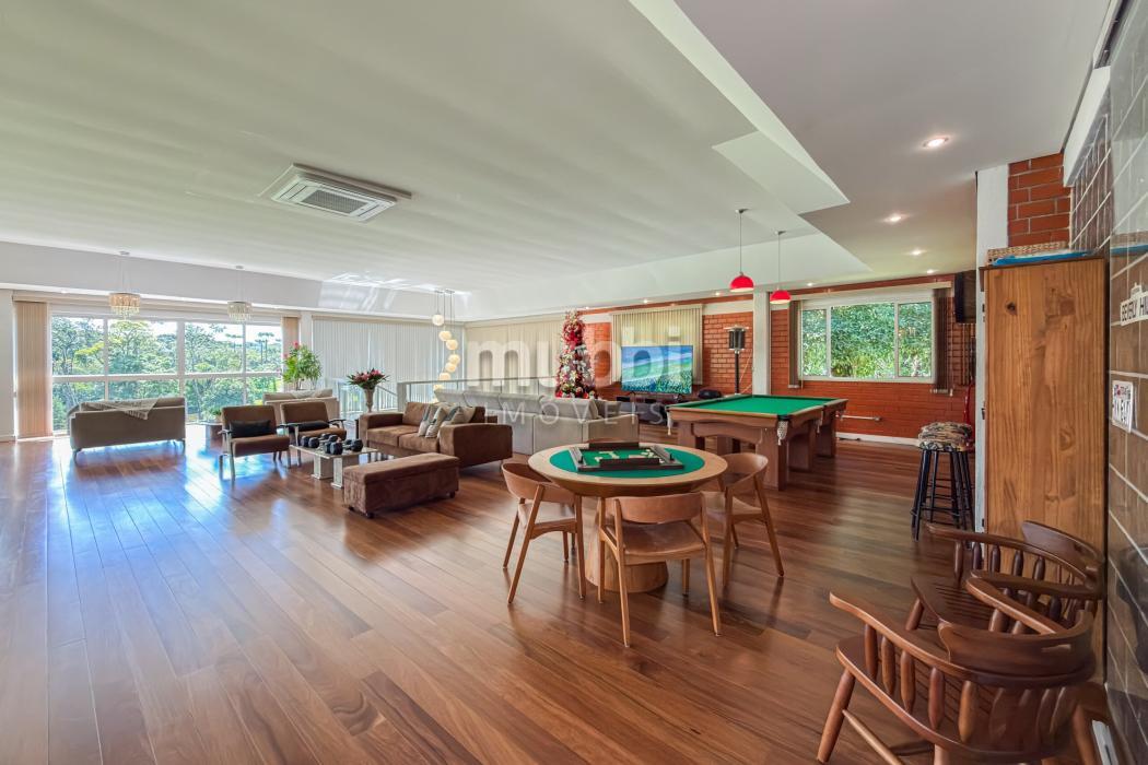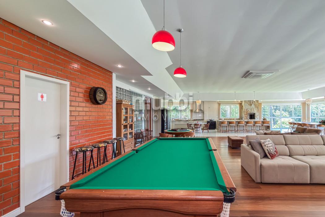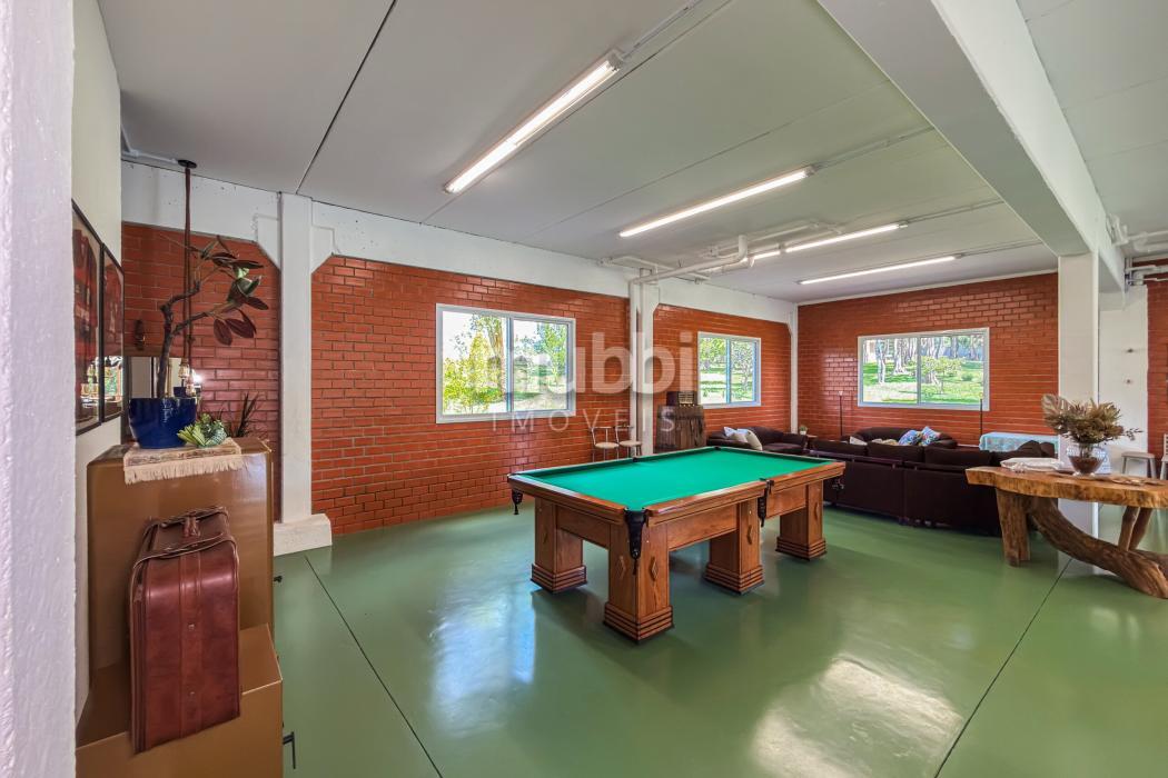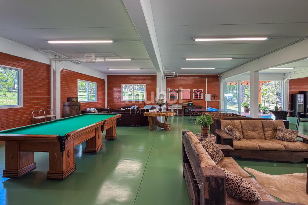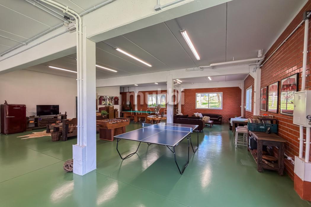 No pavimento inferior, a área de lazer revela a vocação da propriedade para grandes encontros. O espaço gourmet com churrasqueira conecta-se a um salão amplo equipado com mesas de sinuca, ping-pong e jogos, além de mobiliário rústico de alta qualidade.