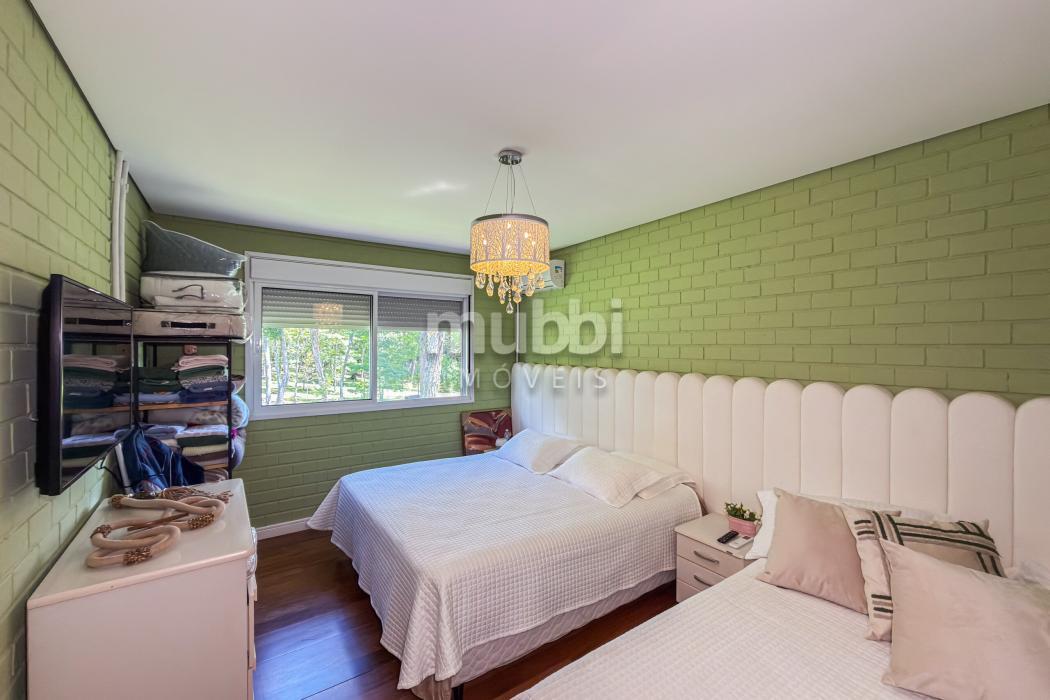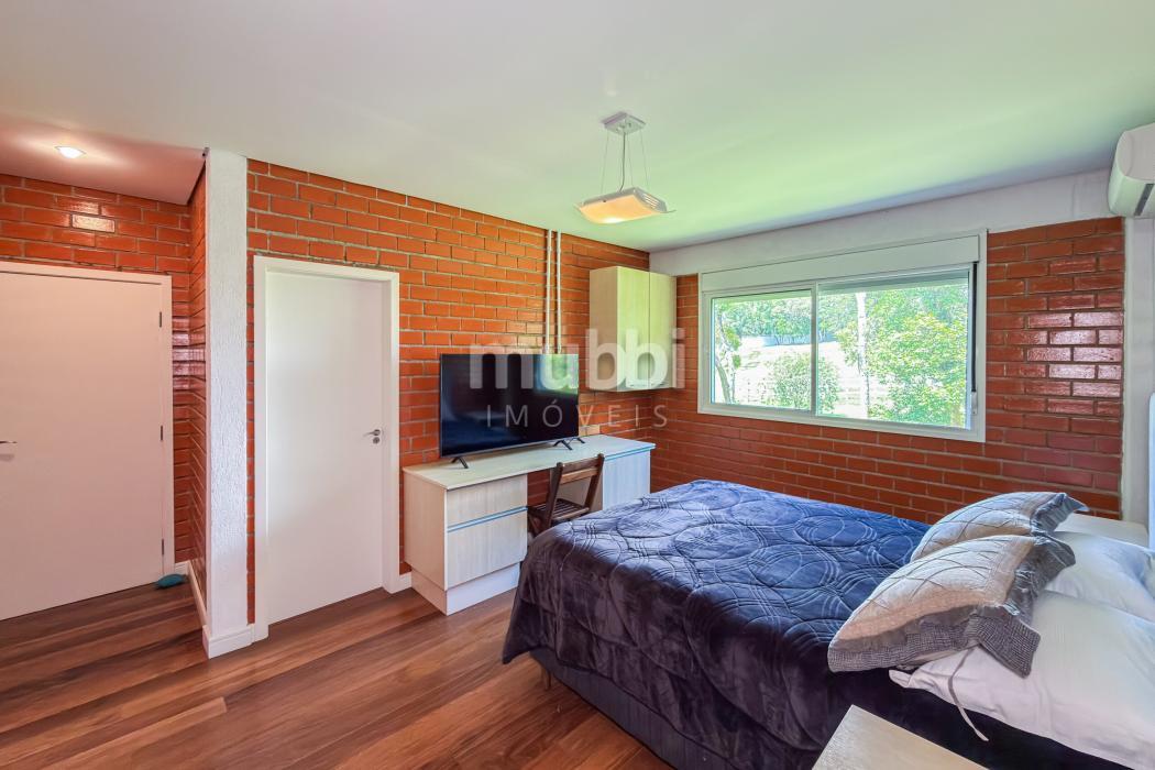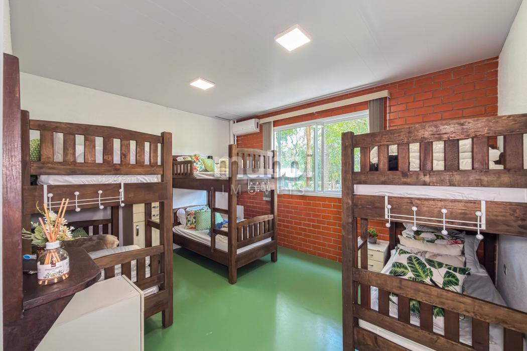 Além das suítes, a casa oferece ainda um dormitório amplo com quatro beliches, solução ideal para acomodar hóspedes, crianças ou grupos em períodos de lazer, mantendo conforto sem comprometer a harmonia da residência.