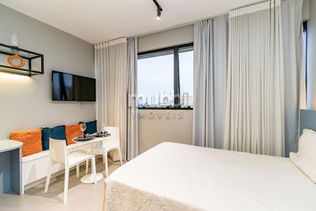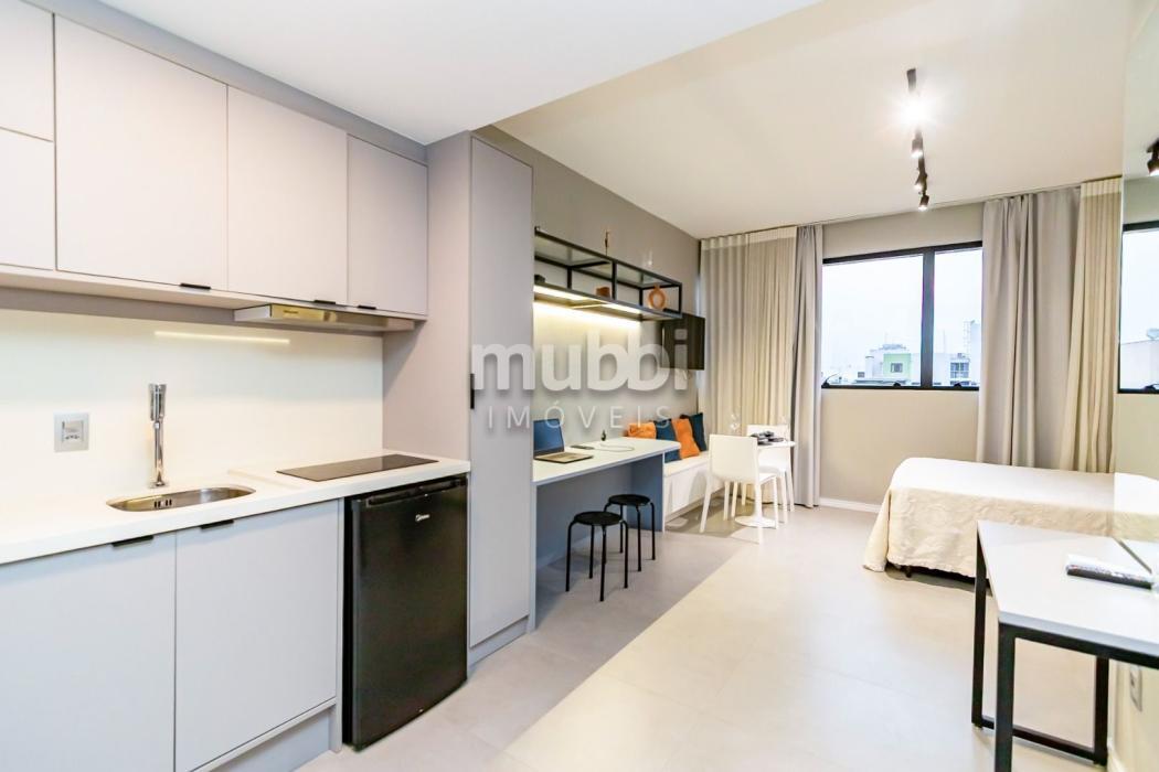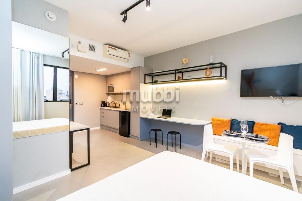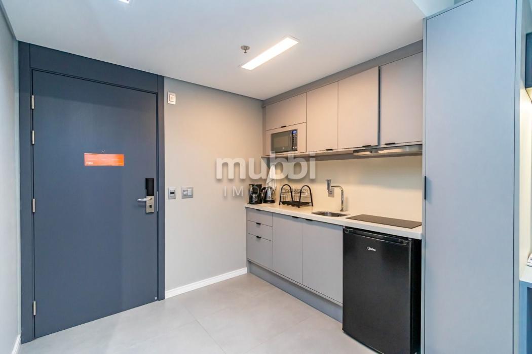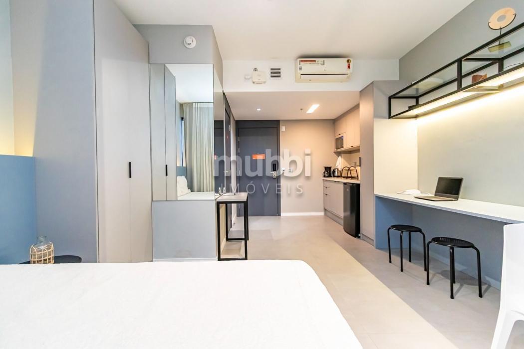 Mobiliado e Equipado: Sem custo extra! O studio já conta com Cama de Casal, Armário planejado, Cozinha privativa completa e Ar-condicionado.
