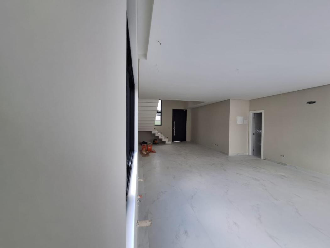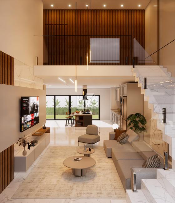 A sala é ampla e integrada com a cozinha e a área de serviço, com piso porcelanato e pé direito duplo na escada de acesso aos quartos.