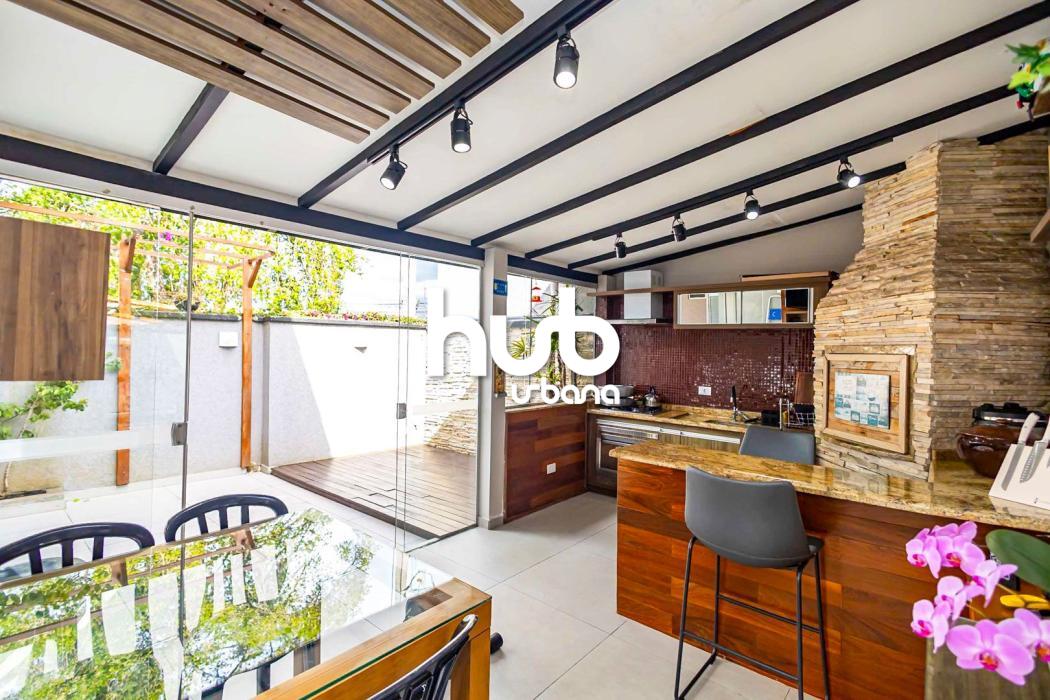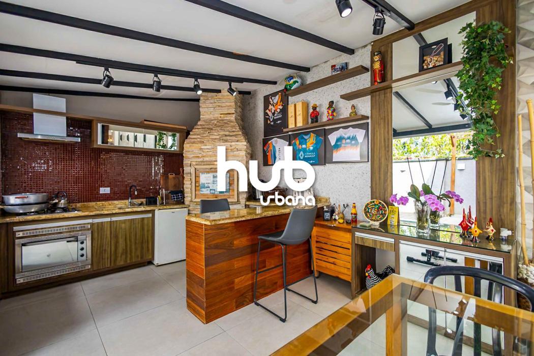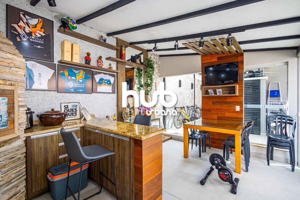 Sala ampla para dois ambientes; lavabo; cozinha; área de serviço; espaço gourmet com churrasqueira carvão; quintal com deck de madeira.
