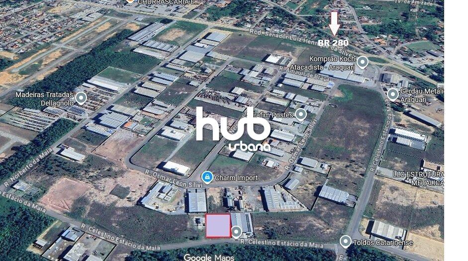 Terreno industrial em Araquari: 2.017 m² de área plana e limpa, com testada de 38 m tanto na frente quanto no fundo, laterais de 54 m e 52 m